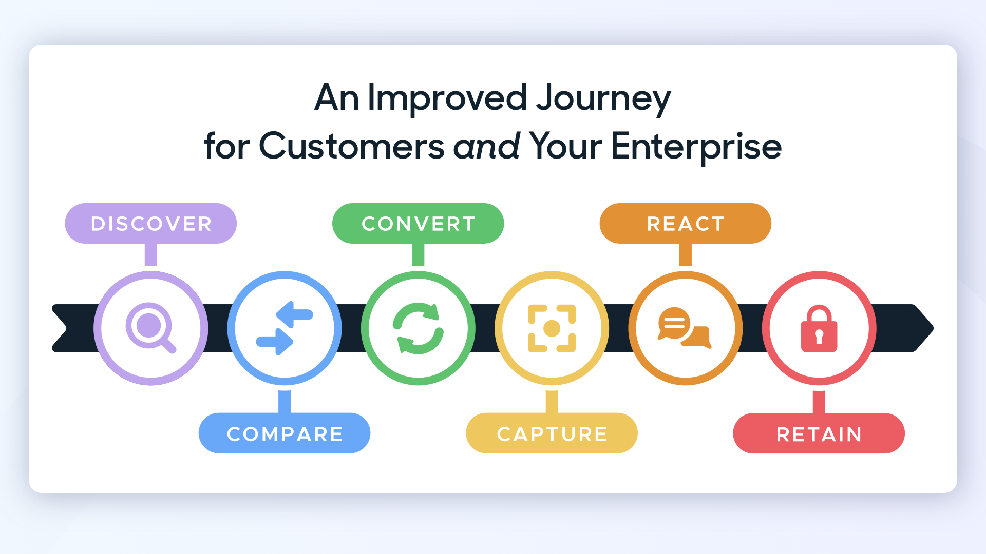 Today, however, we want to share a slightly different concept with you that incorporates the goals of your enterprise into the customer’s journey. Why does this matter? Because your business needs to both see your customers’ behaviors and then react to the data you’ve captured with the creation of a continuously-evolving consumer experience designed to maximize conversions and loyalty. This better model looks like this: